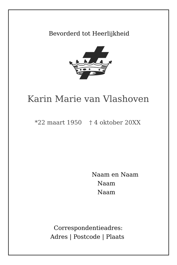 Staande rouwkaart bevorderd tot heerlijkheid. Alle teksten en kleuren zijn naar keuze aan te passen, ook de rouwrand is te verwijderen. (9999)