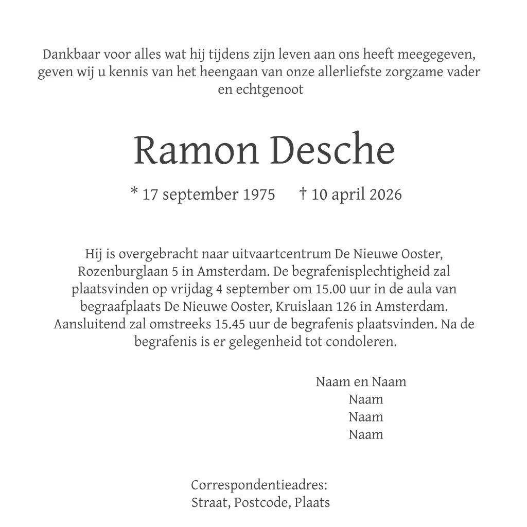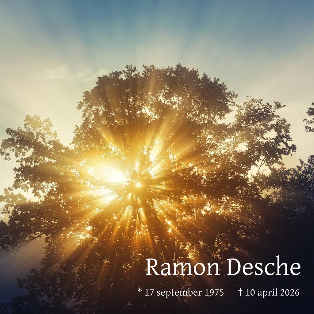 Rouwkaart boom met zonnestralen die tussen de bomen doorschijnen. U kunt de lettertypes aanpassen en ook de foto eventueel vervangen (1090).