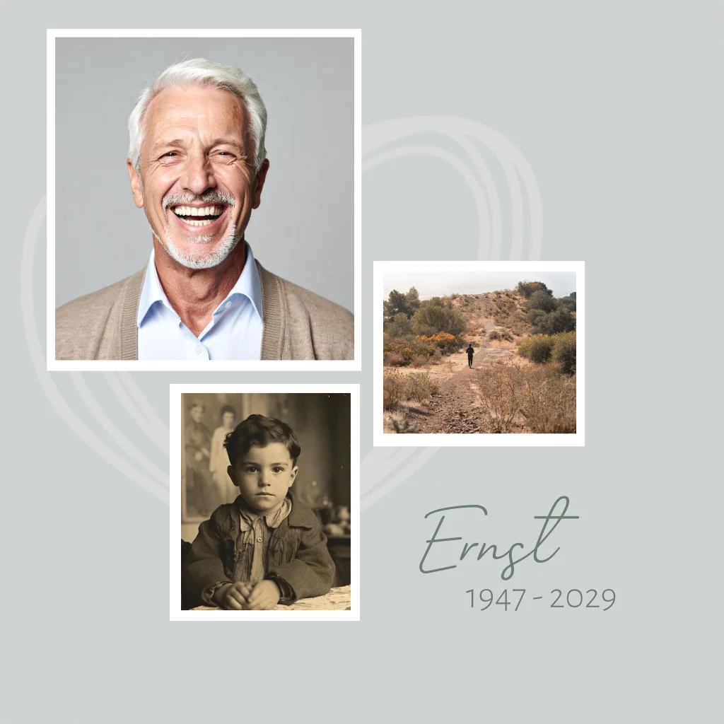 Eenvoudige grijze fotocollage als rouwkaart. Personaliseer in onze editor ter herinnering aan een geliefde. (555555)
