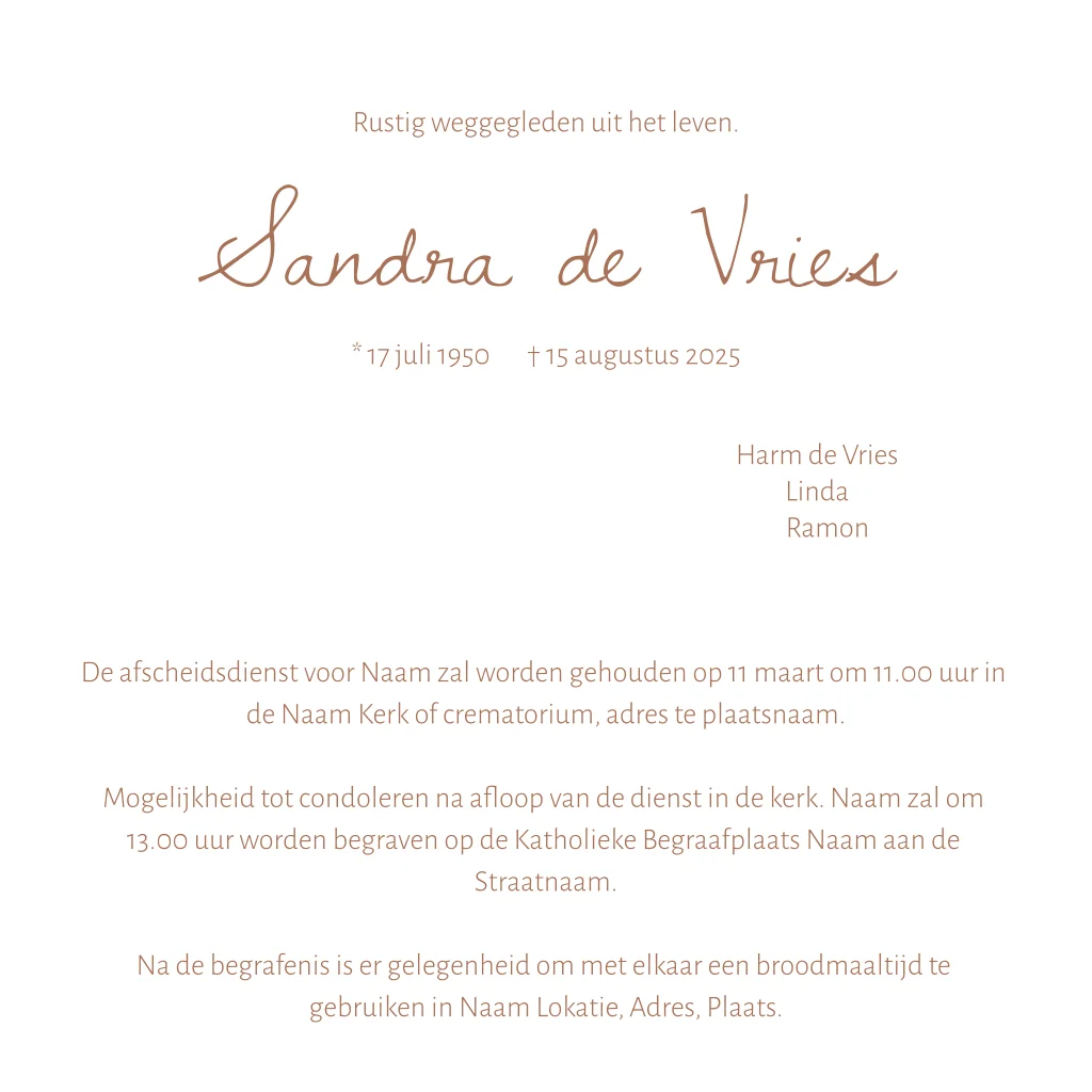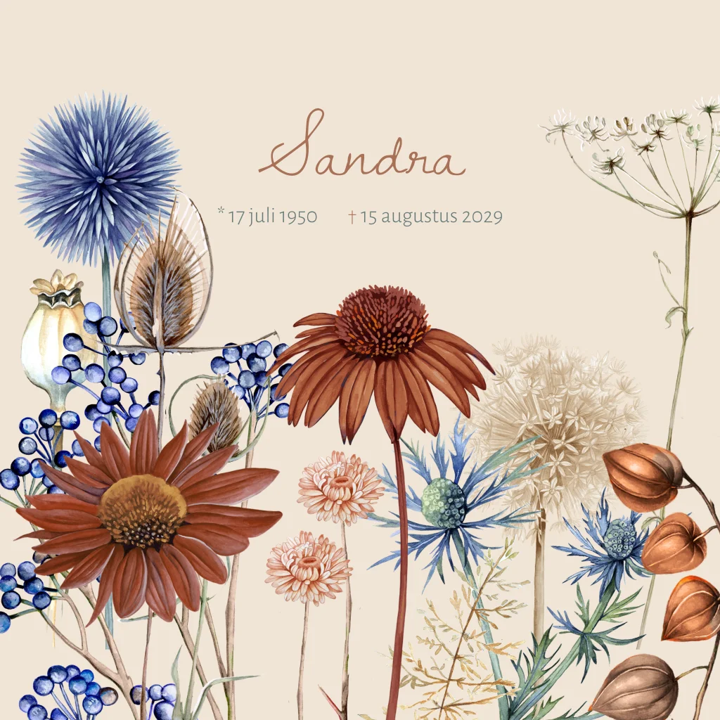 Rouwkaart met mooie blauw en bruine bloemen omringd door takken. (1151)