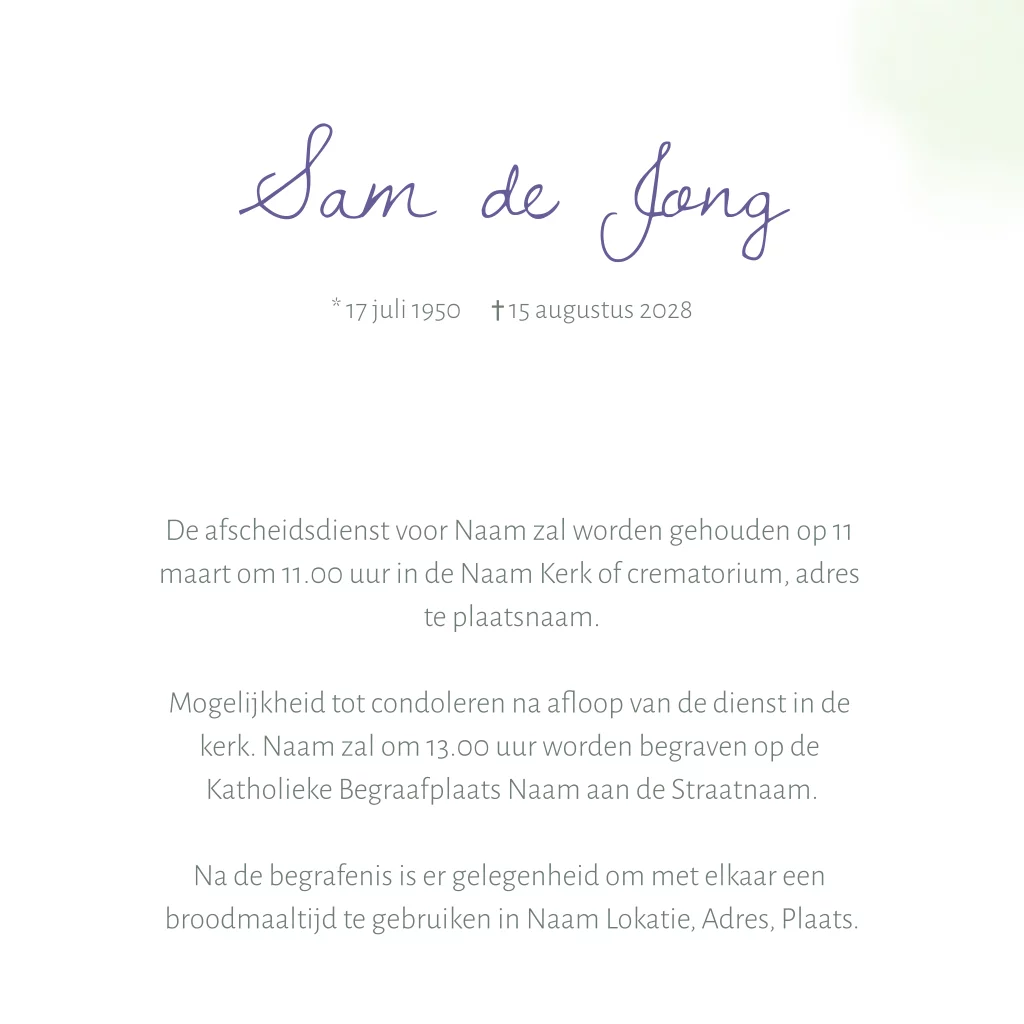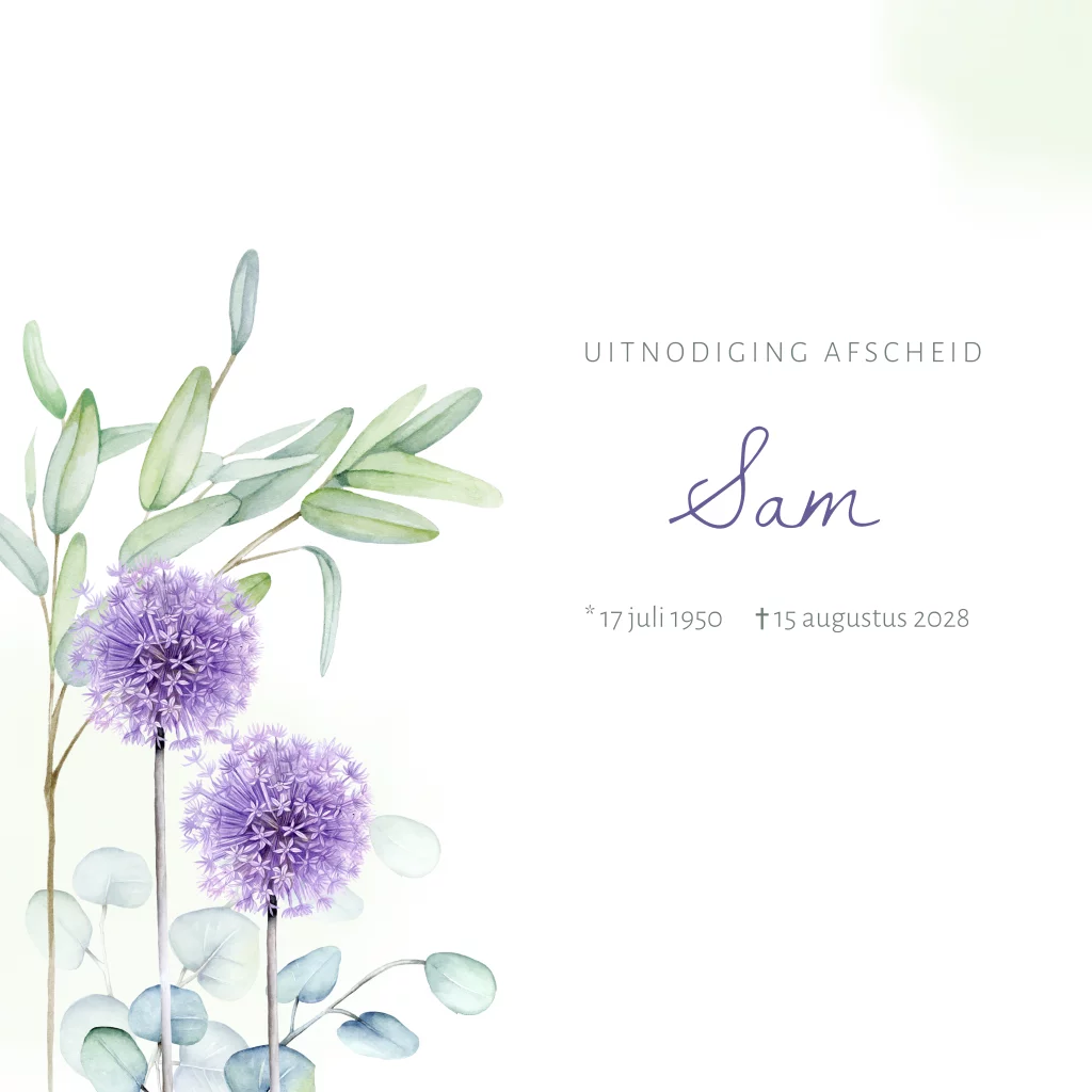 Rouwkaart met sfeervolle bloemen in het paars en eucalyptus blad. (803)