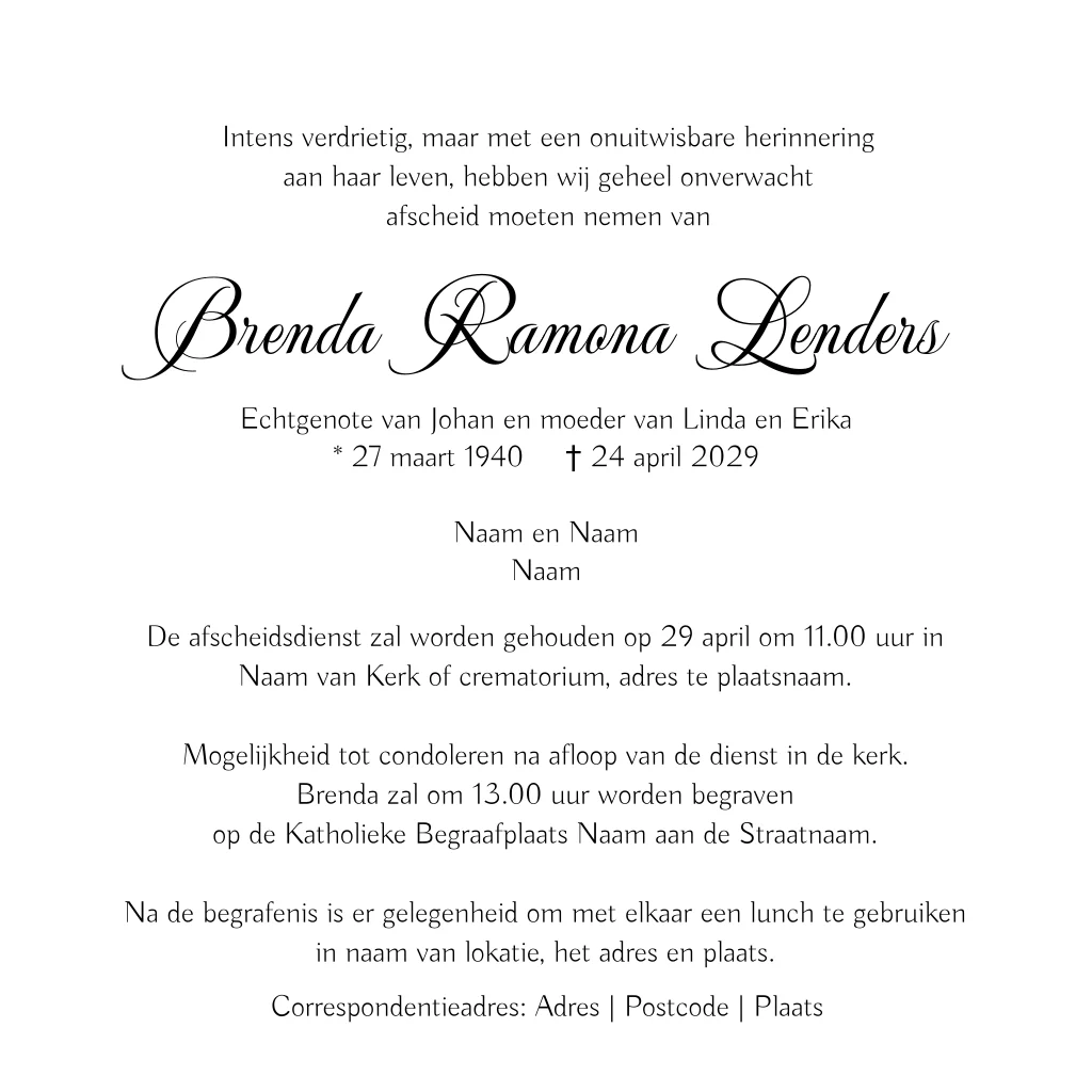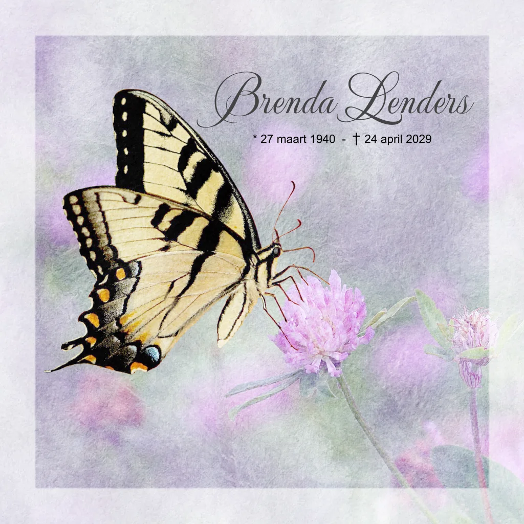 Rouwkaart voor een vrouw met paarse bloemen en een prachtige vlinder. (764)