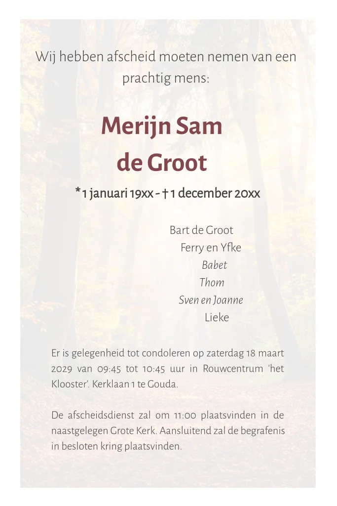 Rouwkaart met een bos bomen en herfst bladeren