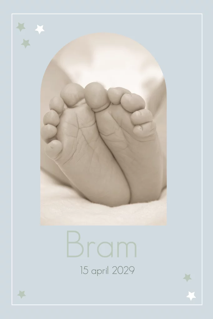 Rouwkaartje voor een baby jongen met een boogvormig fotokader voor het plaatsen van een eigen foto. Een blauwe achtergrond met sterretjes. (1275)
