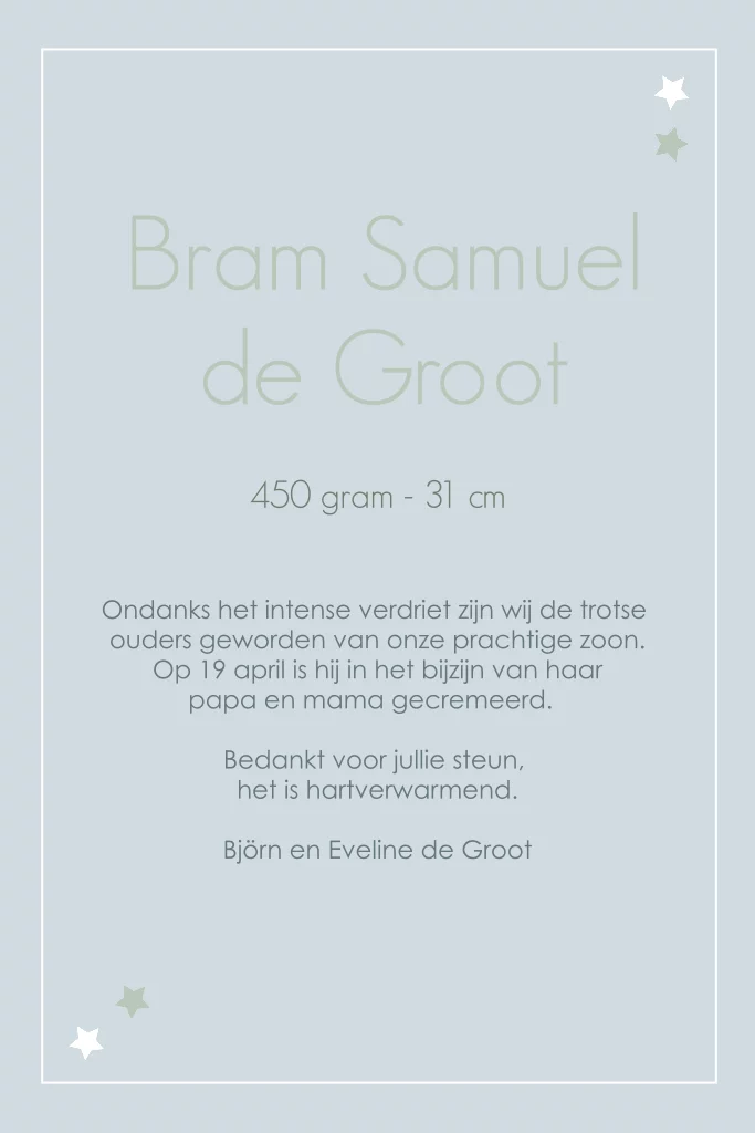 Rouwkaart voor een baby jongetje blauw met foto kader