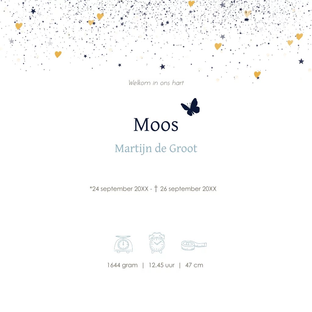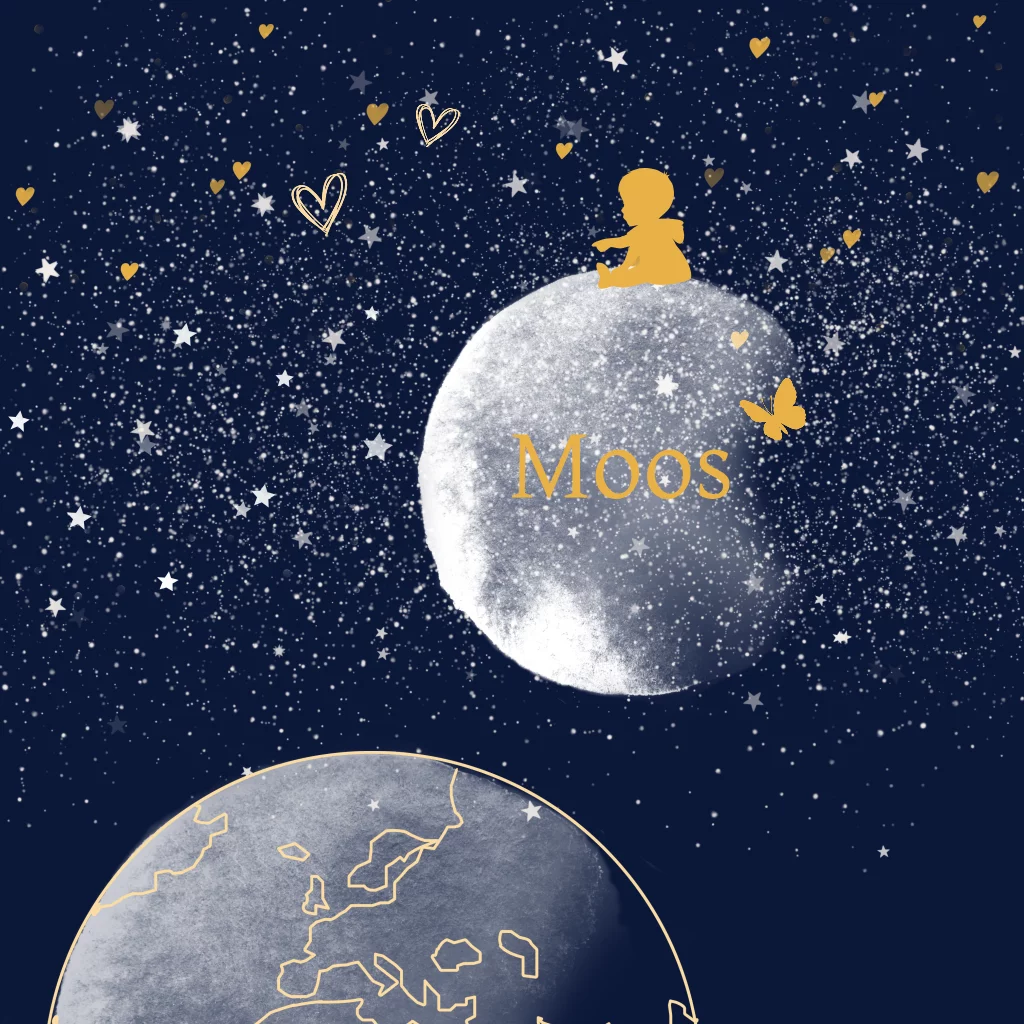 Een baby rouwkaart voor een te vroeg geboren / overleden jongetje met een silhouet van een zoontje op de maan en de wereldbol en de sterrenhemel. Plaats eventueel een foto aan de binnenzijde van deze kaart. (555555)