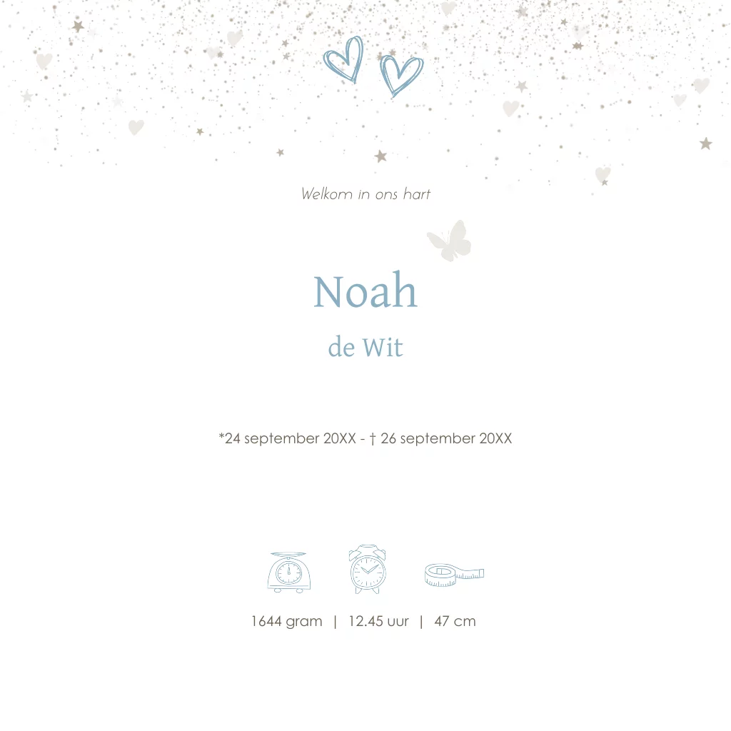 Een lief rouwkaartje voor een afscheid van jullie zoontje met het silhouet van een klein jongetje op de maan, omringd door kleine sterretjes en hartjes en de wereldbol. Aan de binnenzijde van de kaart is er ruimte voor jullie teksten en eventueel een foto van jullie kindje. (555555)
