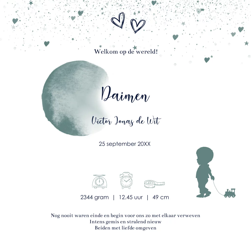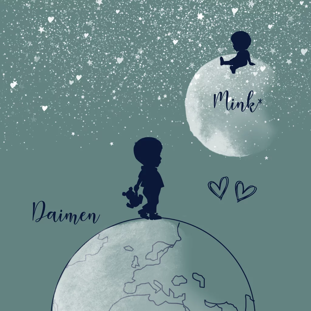 Een silhouet geboorte-rouwkaartje voor een tweeling waarvan èèn van de kindjes is overleden. Een silhouet rouwkaartje met een wereldbol, sterretjes en hartjes. (555555)