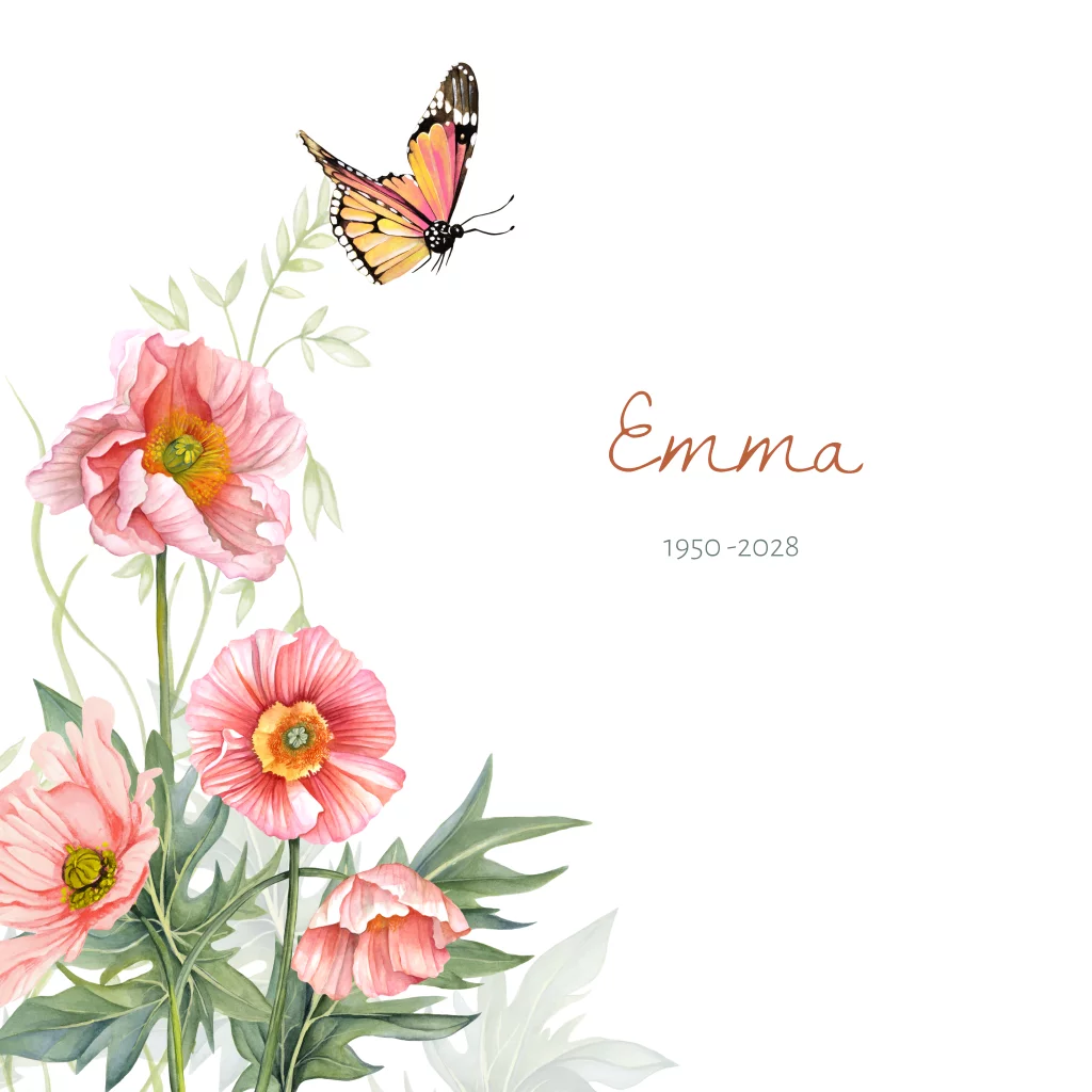 Rouwkaart met mooie getekende klaprozen rood-roze in pastel kleur en een mooie vlinder. (909)