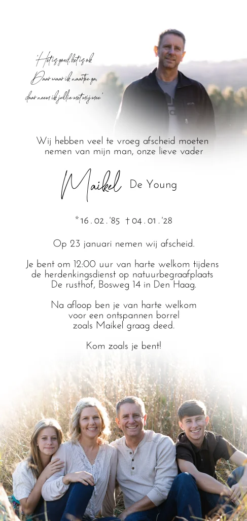 Moderne langwerpige rouwkaart van 10 x 21 centimeter met ruimte voor 2 foto's zoals een familiefoto en een portret.