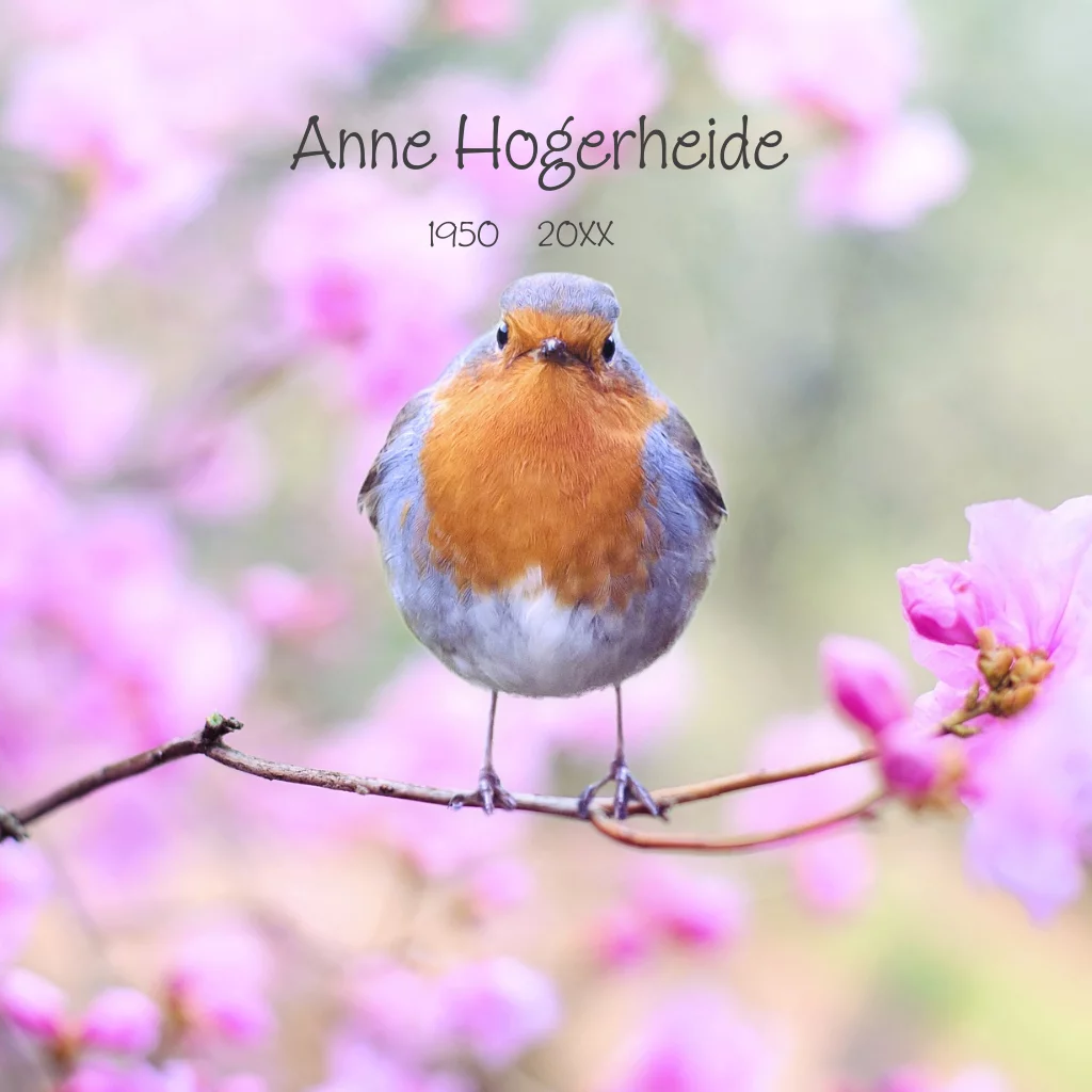 Rouwkaart met een foto van een roodborstje met roze bloesem. (524)