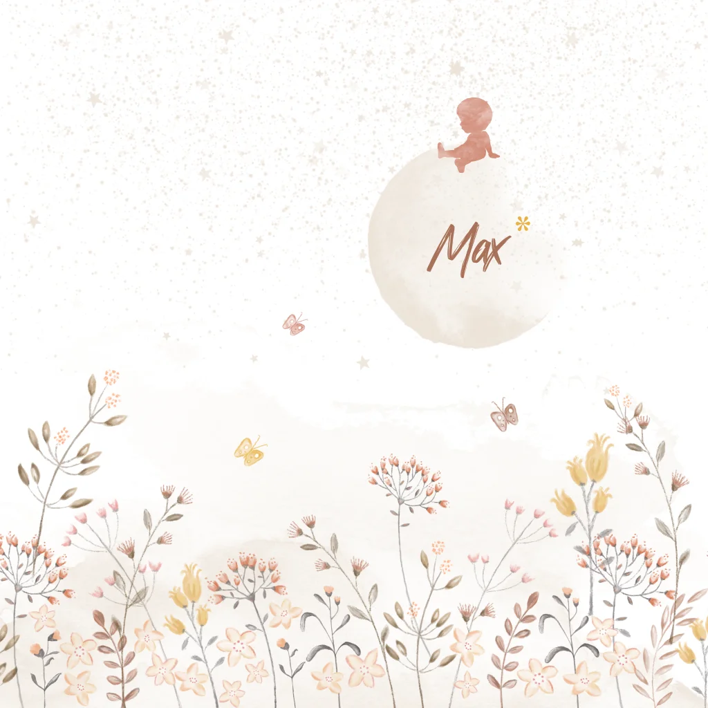 Een lief waterverf rouwkaartje voor een jongetje met hand geschilderde bloemetjes en vlindertjes en een aquarel silhouet van een jongetje op de maan. Pas deze rouwkaart naar eigen wens aan.