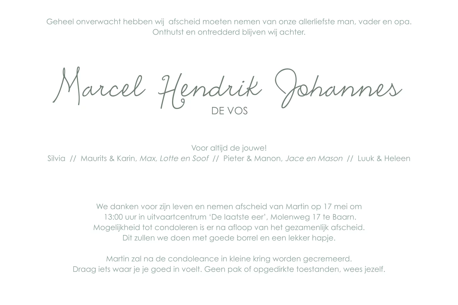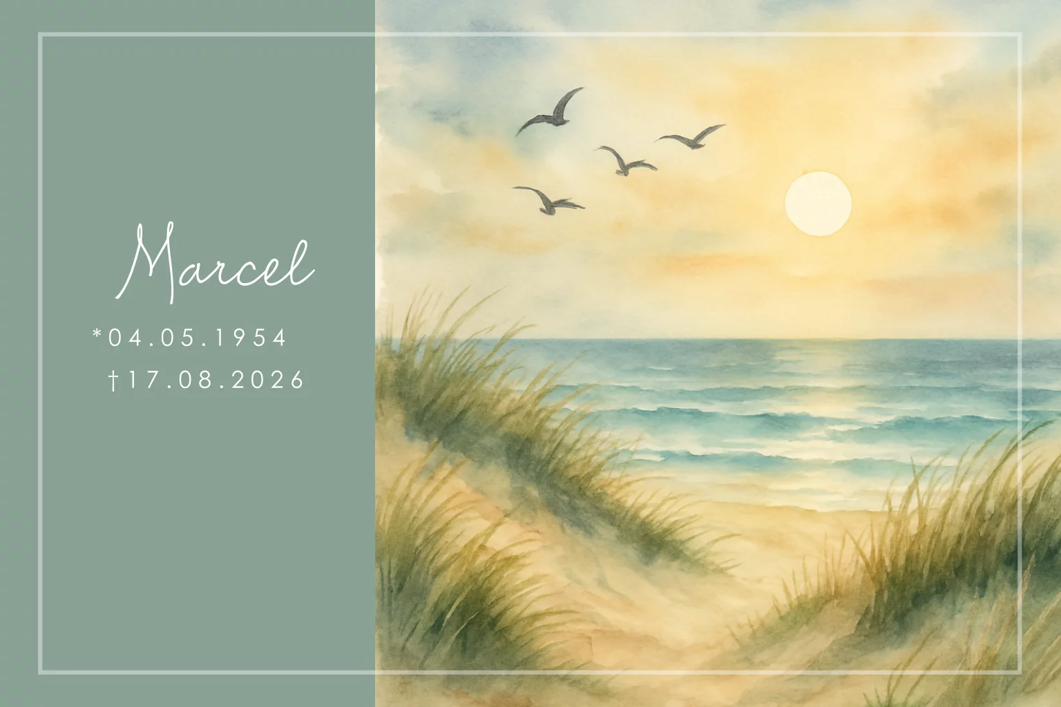 Rouwkaart man met aquarel duinen zee zon en vogels