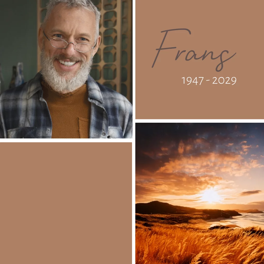 Rouwkaart man meerdere foto's ondergaande zon
