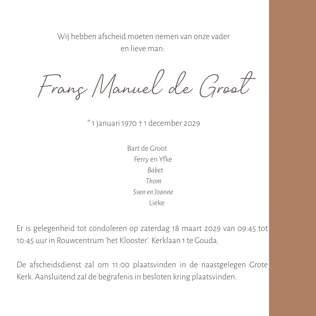 Een moderne rouwkaart voor een man met meerdere vlakken voor het plaatsen van een eigen foto. In een warme koperkleur. (1241)
