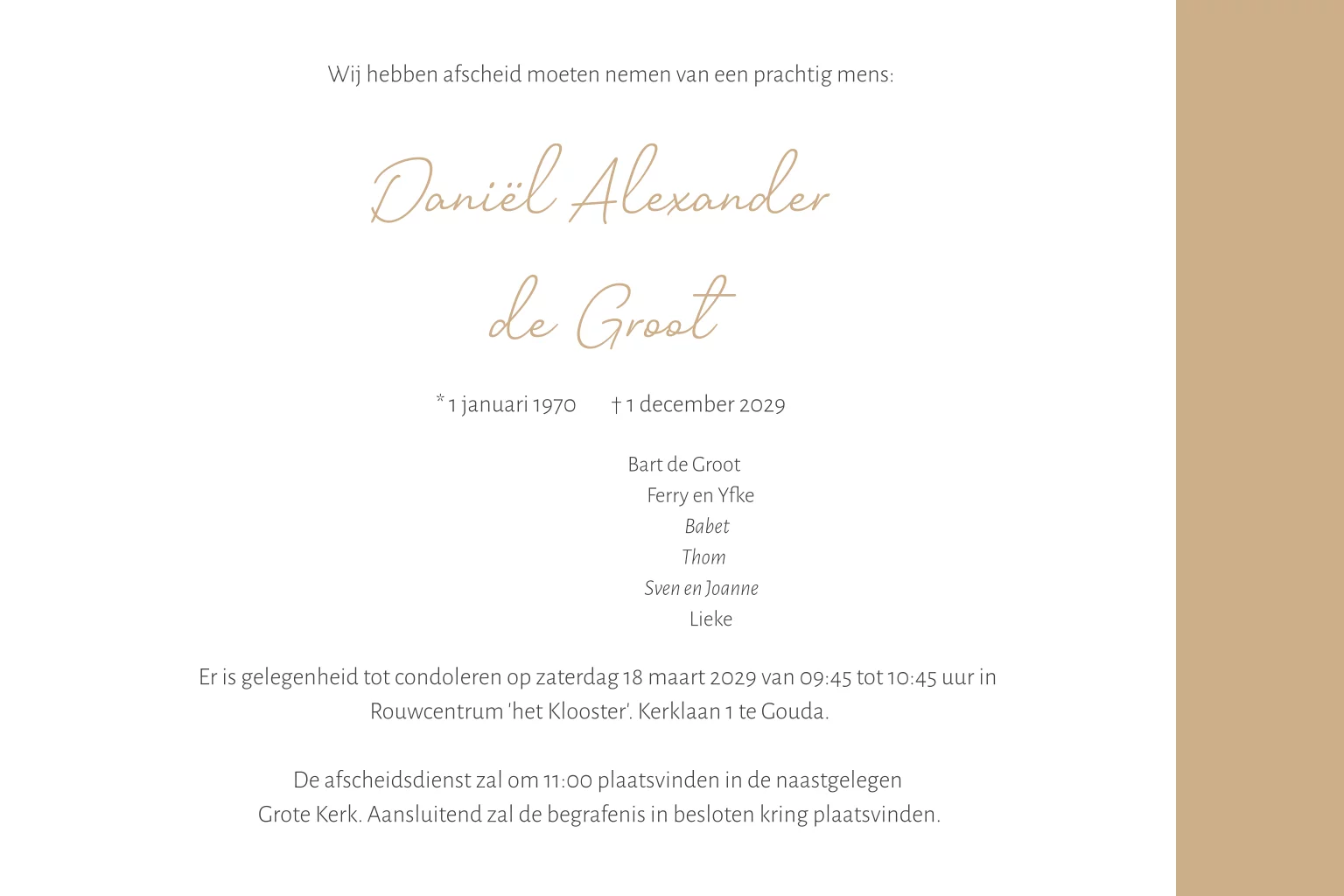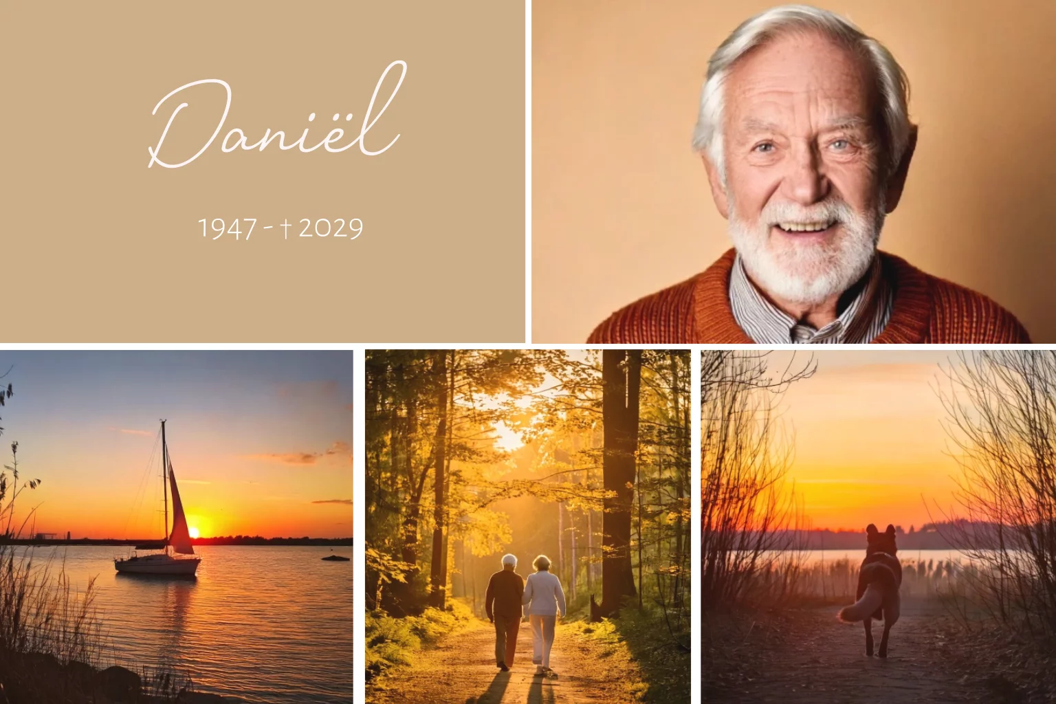 Moderne rouwkaart voor een man in warme kleur met ruimte voor het plaatsen van meerdere eigen foto's. Afbeelding van een zeilboot en natuur. (999999)