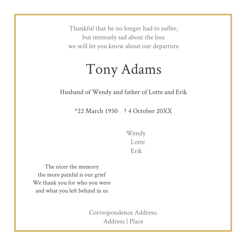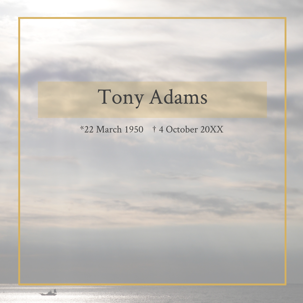 Modern funeral card in English with mourning morning morning sky with clouds and water. All texts and colors can be changed as desired.