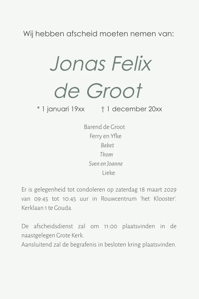 Moderne rouwkaart voor een man met kleurvlak en ruimte voor het plaatsen van een eigen foto.
