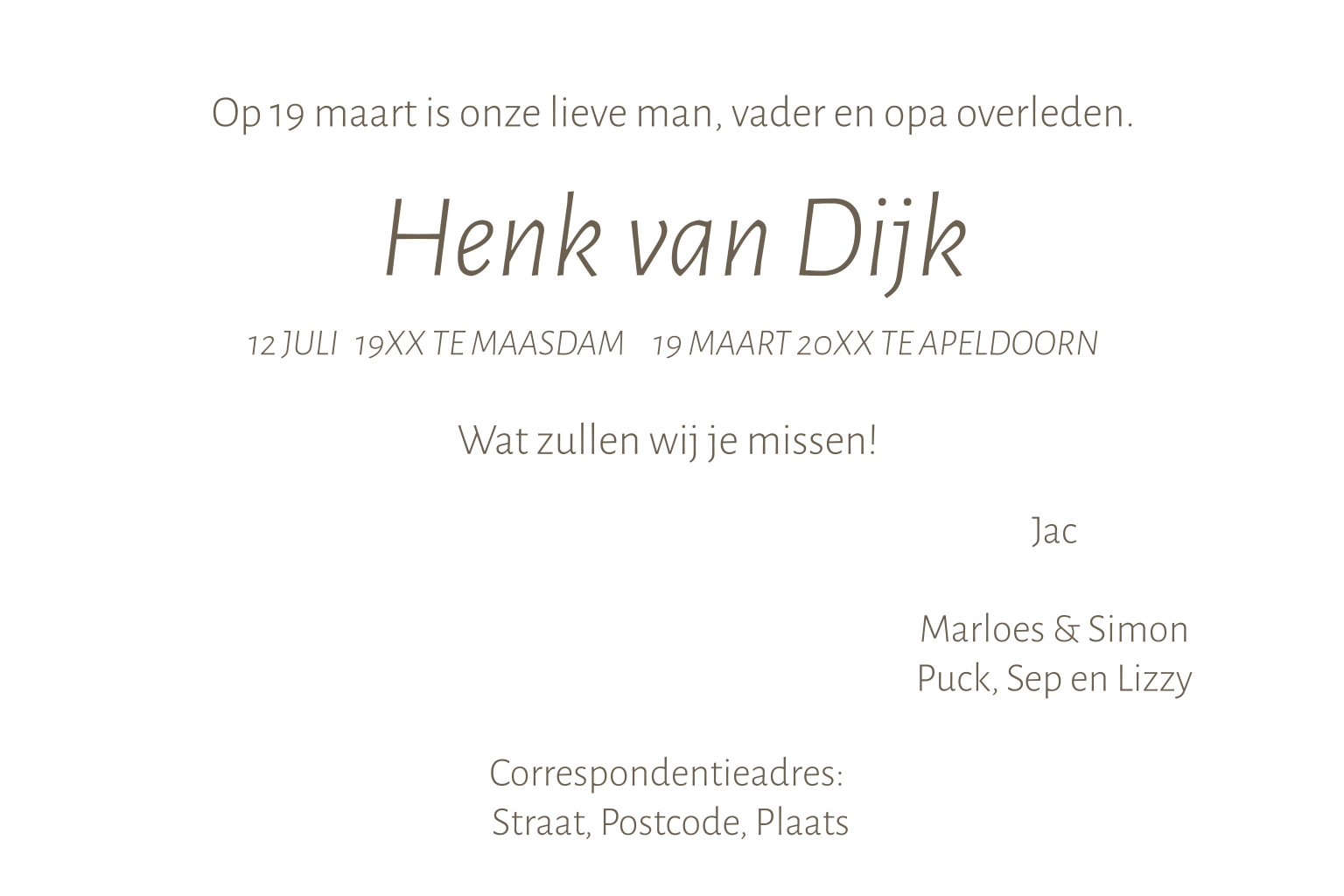 Rouwkaart met een foto van de zee, strand en een ondergaande zon. (506).