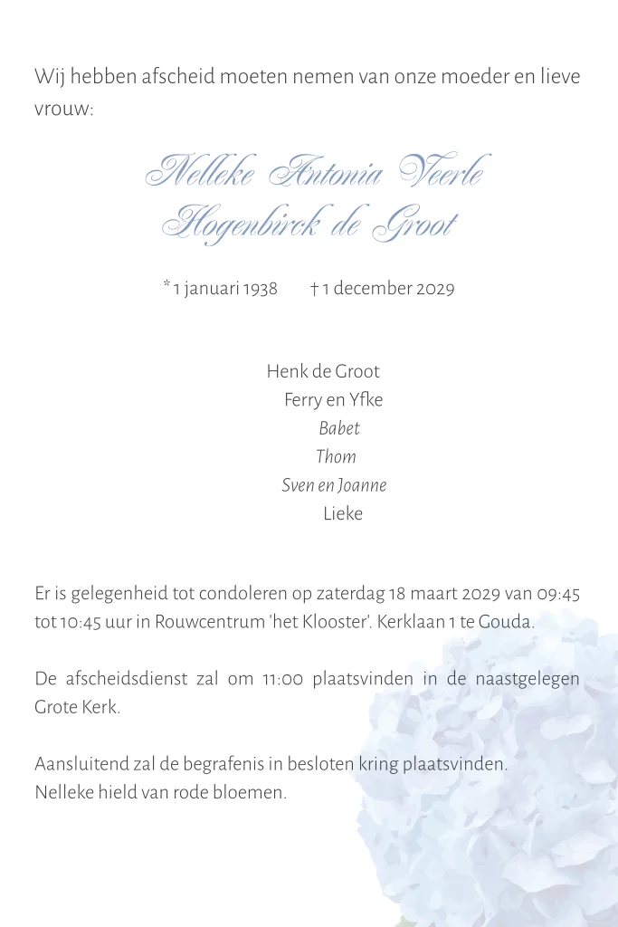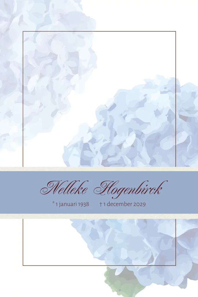 Rouwkaart met foto en blauwe hortensia in aquarel. (1208)
