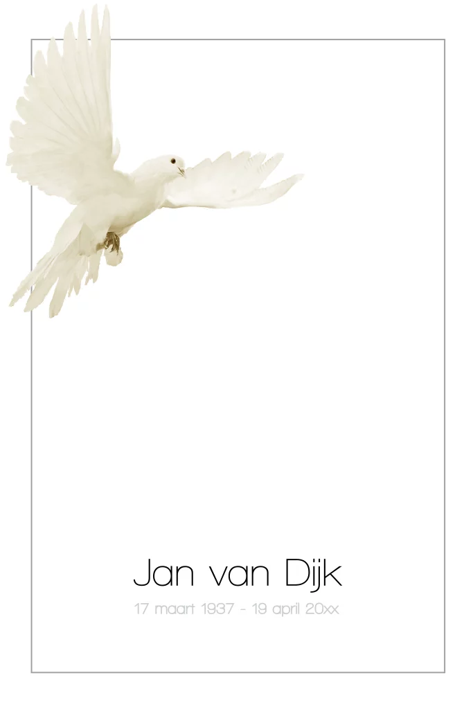 Rouwkaart met een witte duif. Dit betreft een staande kaart, ook in vierkant en liggend formaat verkrijgbaar. De rouwrand is ook te verwijderen (9999). TIP: Bekijk onze ruime collectie rouwkaarten via > Rouwkaarten