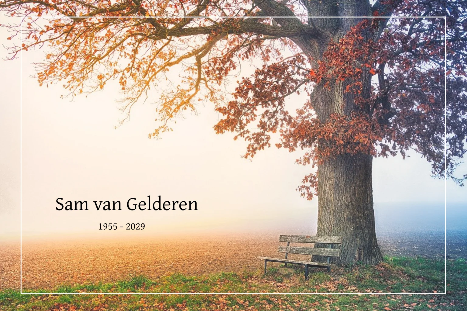 Rouwkaart met eenzaam bankje in het park. Met een grote boom met herfstbladeren en een weg pad
