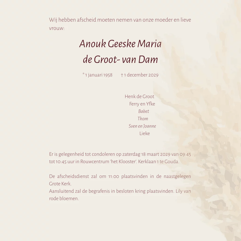 Rouwkaart met ruimte voor een eigen foto en pampas gras
