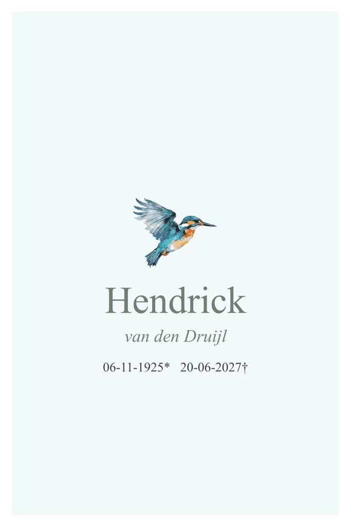 Een rouwkaart met een getekende aquarel ijsvogel Er kan in deze rouwkaart een foto van de overledene geplaatst worden. (1114)