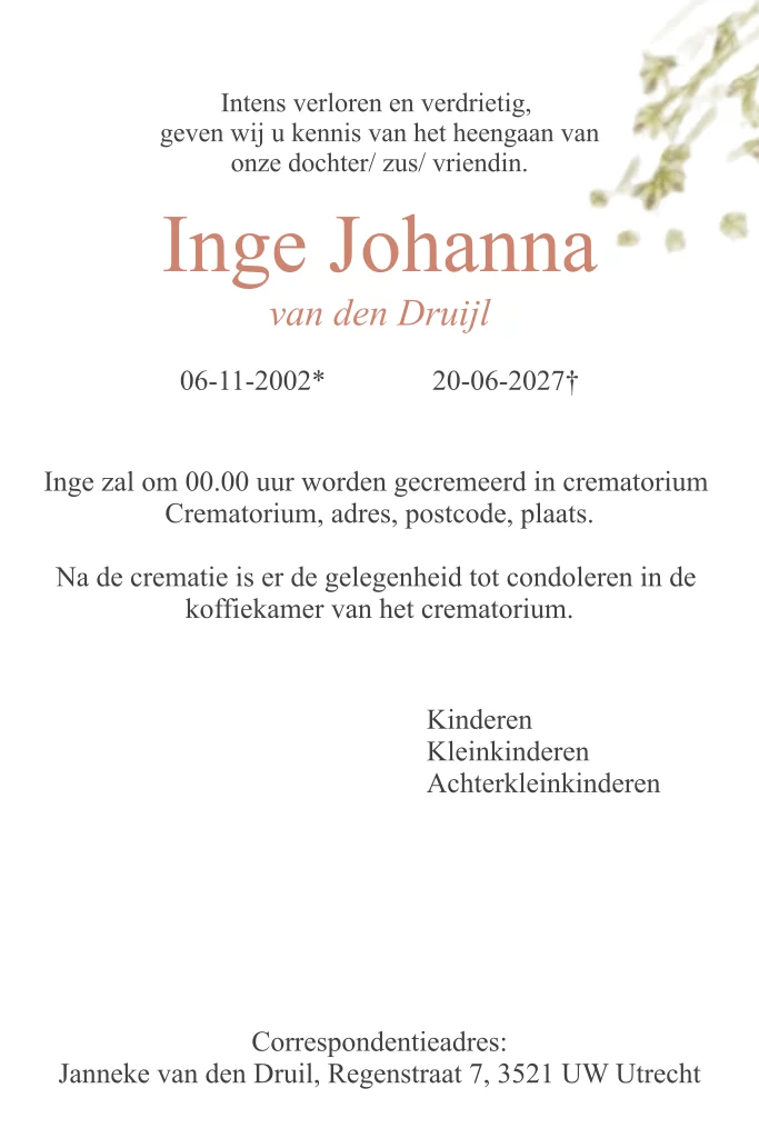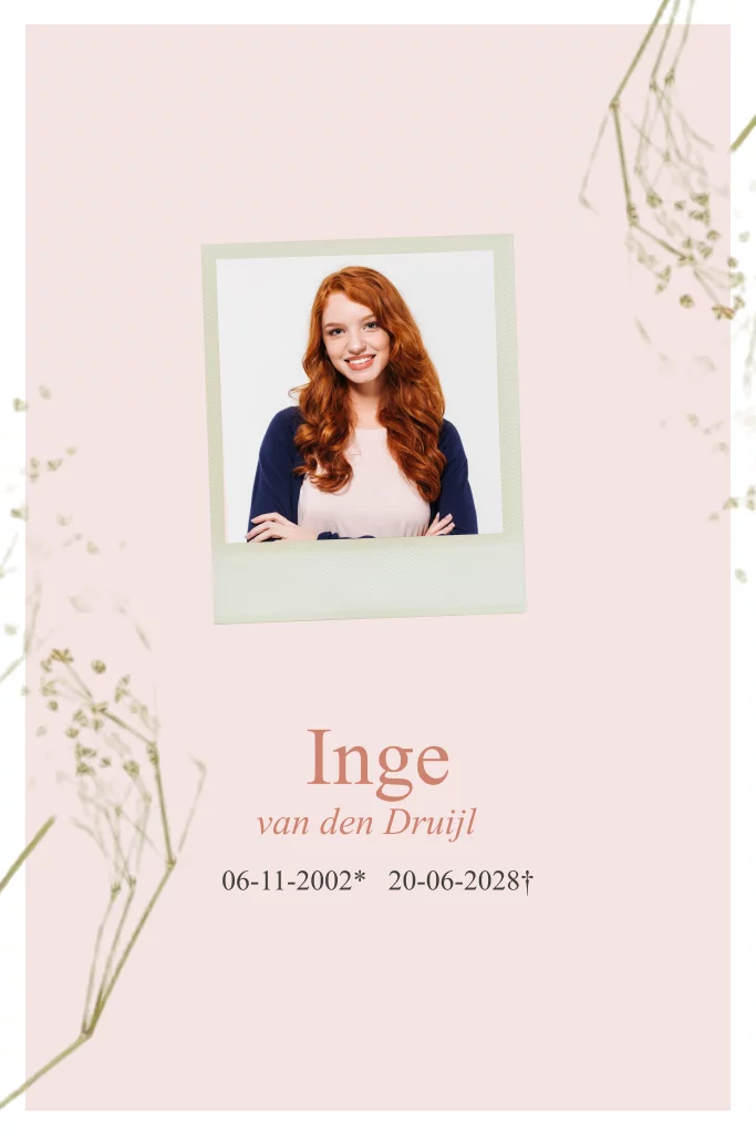 Rouwkaart voor een vrouw met foto en gipskruid