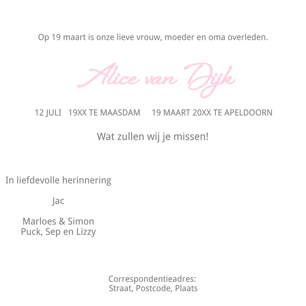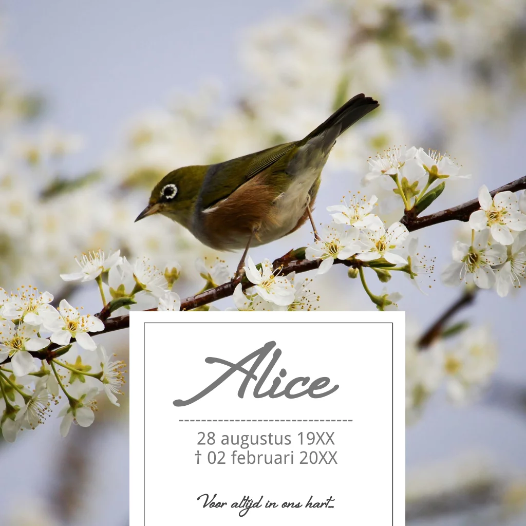 Rouwkaart met lentetak en vogel koekoeksvogel. Alle teksten en kleuren zijn naar keuze aan te passen. (522)