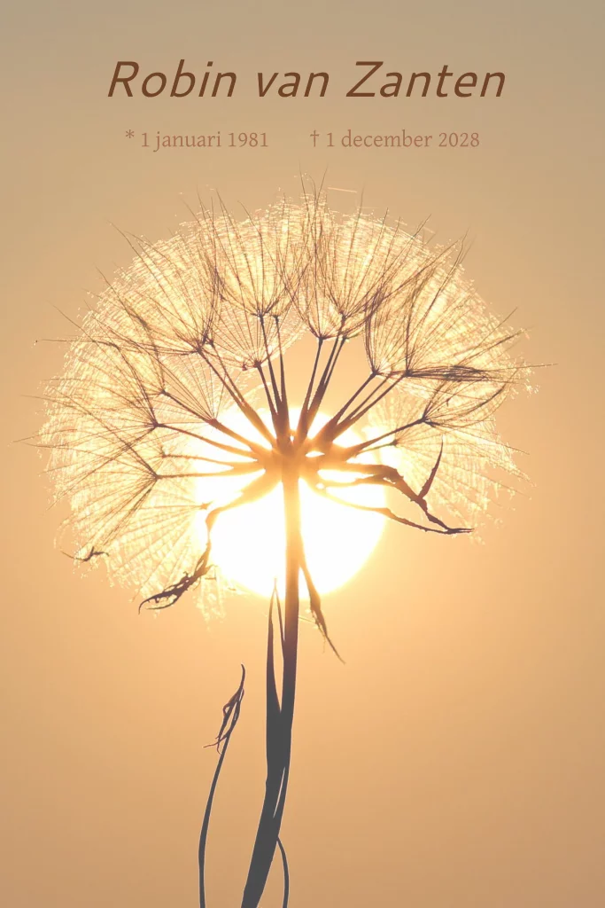 Rouwkaart met uitgebloeide paardenbloem en de zon