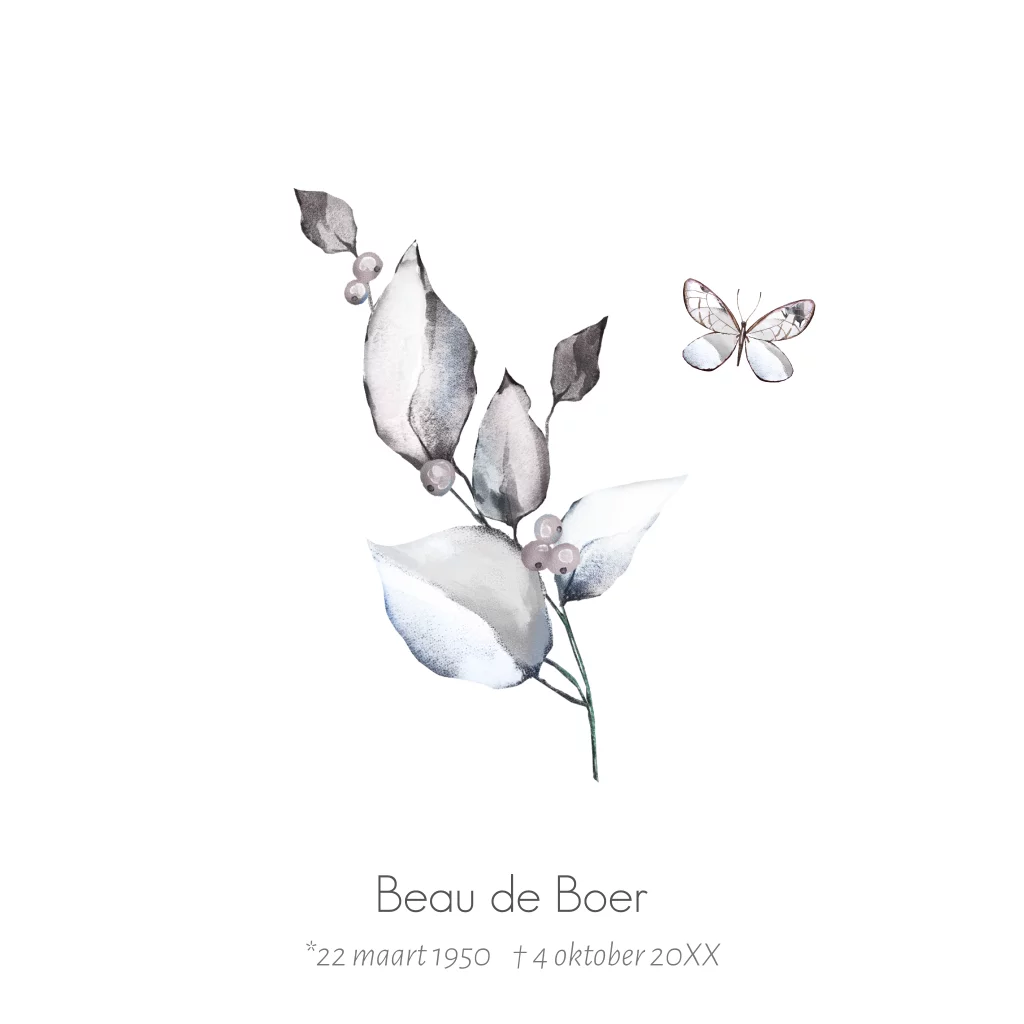 Rouwkaart met geschilderde tak in paars tinten en vlinder. (805)