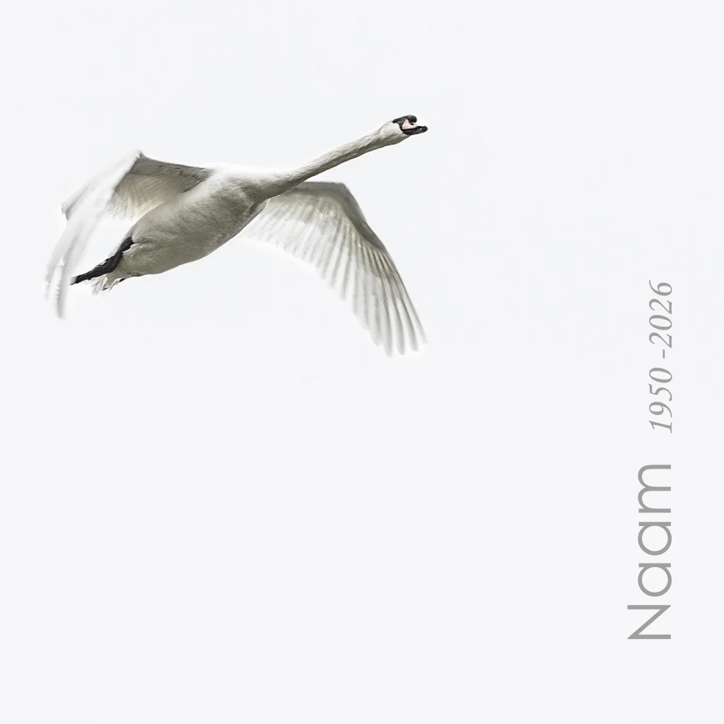 Rouwkaart met foto van een vliegende zwaan. Eventueel vervangt u de foto door een eigen foto.