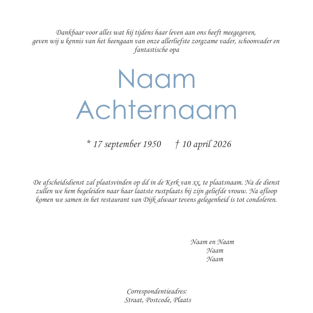 De lettertypes zijn ook naar wens aan te passen. (9999) TIP: Bekijk onze ruime collectie rouwkaarten via > Rouwkaarten