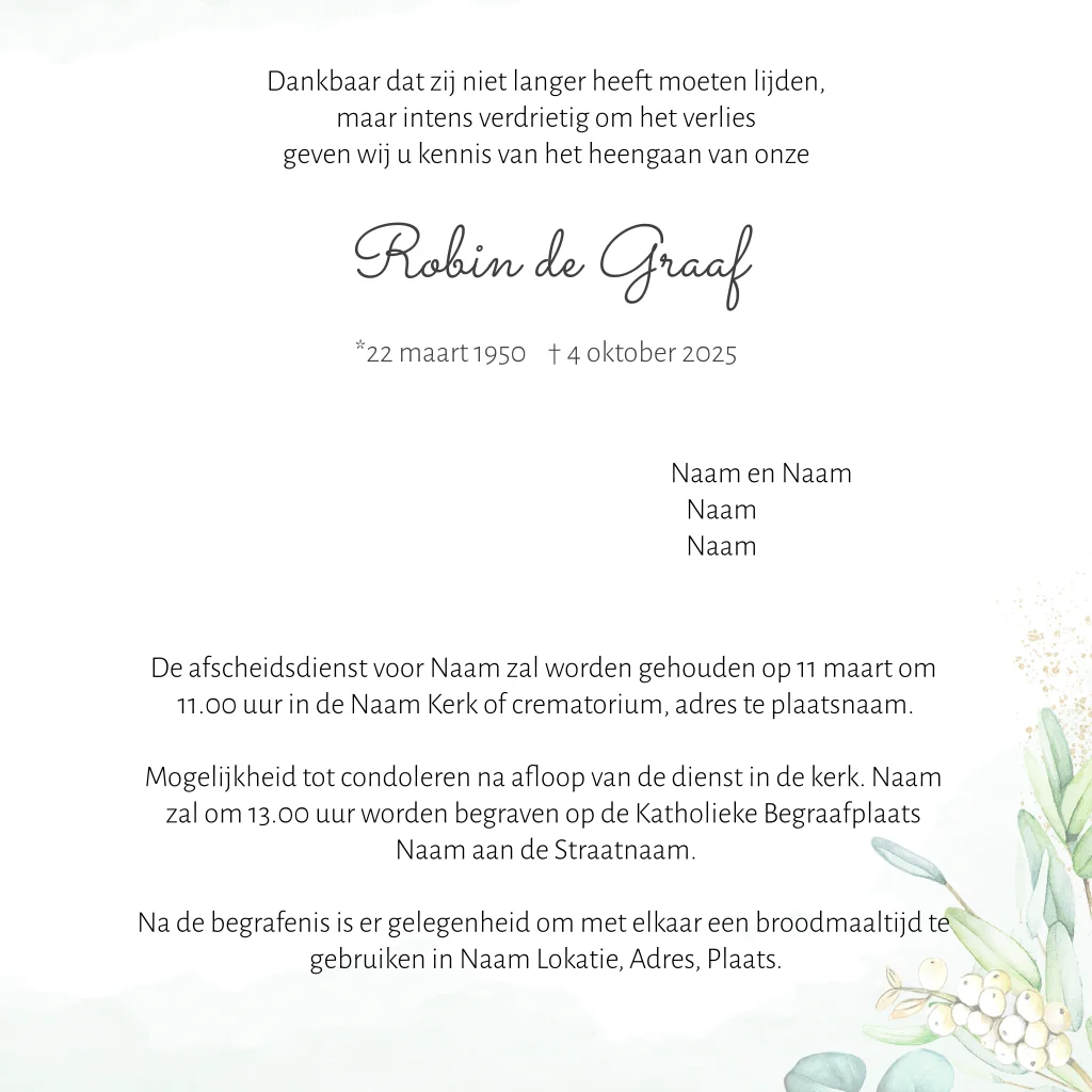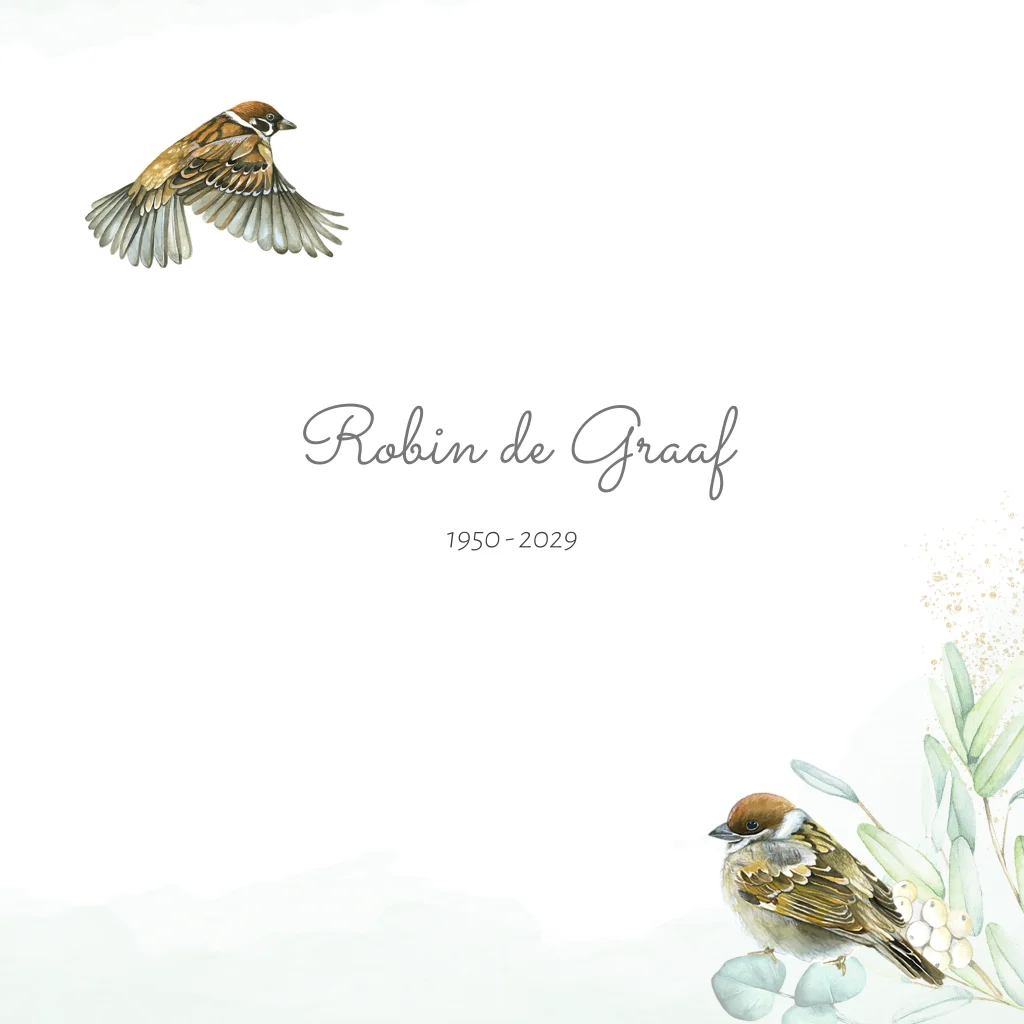 Rouwkaart met vogels. Mus Huismussen Mussen en groene takjes. (888)