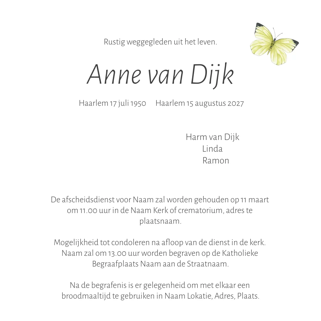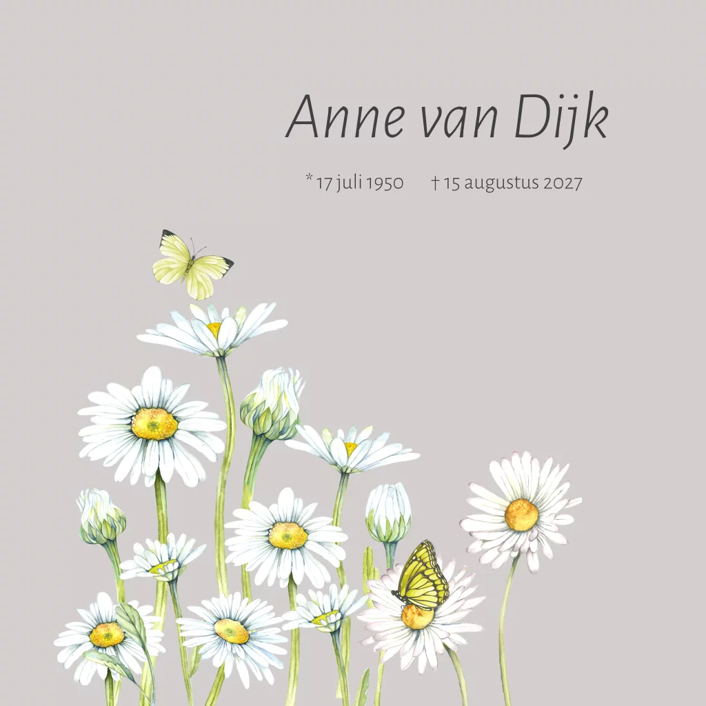 Rouwkaart met witte bloemen, margrietjes en vlinders. (875)