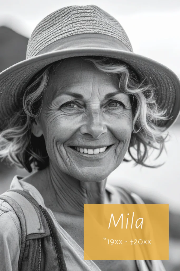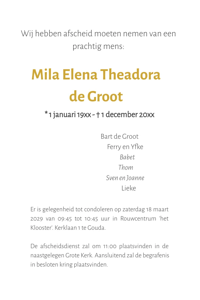 Rouwkaart voor een vrouw met ruimte voor het plaatsen van een eigen foto. Minimalistisch met een gekleurd vlak.