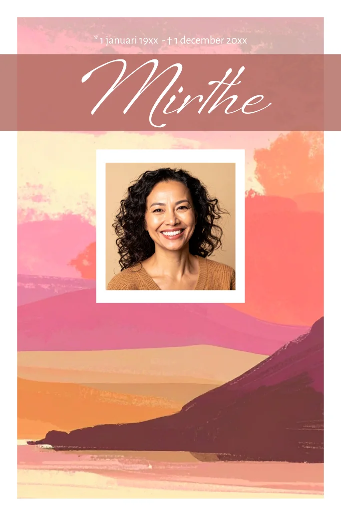 Moderne rouwkaart voor een vrouw met abstracte bergen en zon in bruin roze tinten. Er is ruimte voor het plaatsten van een eigen foto. (555555)