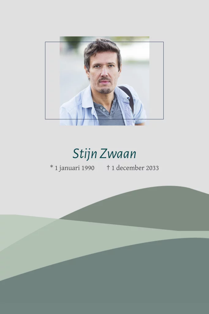 Rouwkaart man met foto en moderne bergen in groen tinten