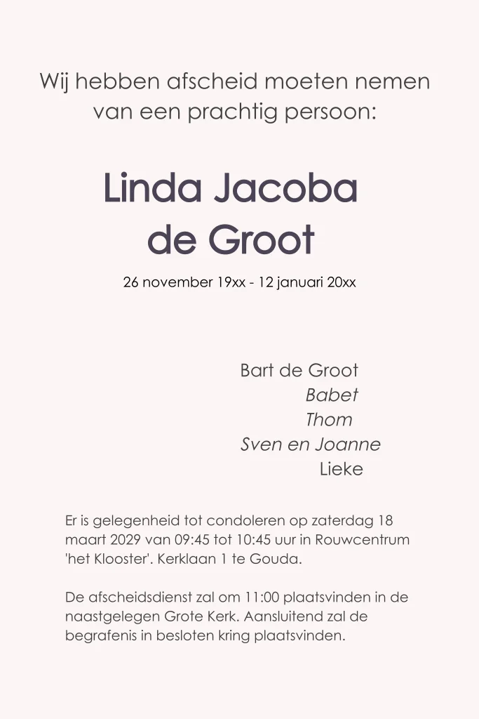 Rouwkaart voor een vrouw met moderne lettertype en ruimte voor het plaatsen van een eigen portret foto.