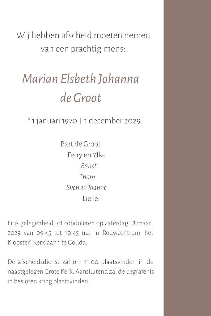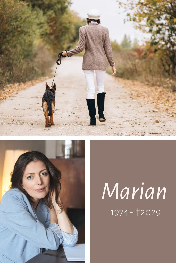 Moderne rouwkaart voor een vrouw met meerdere vlakken voor het plaatsen van foto's. Voor bijvoorbeeld hobby, beroep, sport of het plaatsen van een eigen foto. (1267)