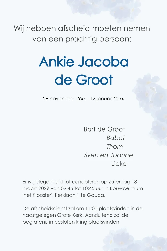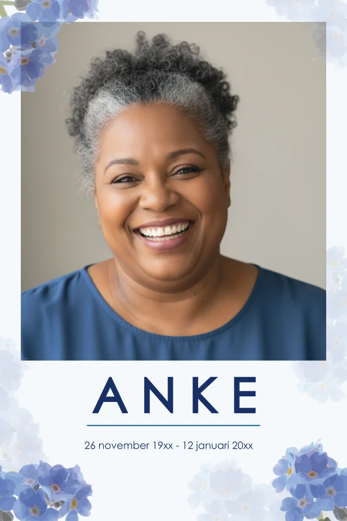 Rouwkaart voor een vrouw met blauwe aquarel bloemen en ruimte voor het plaatsen van een eigen foto.