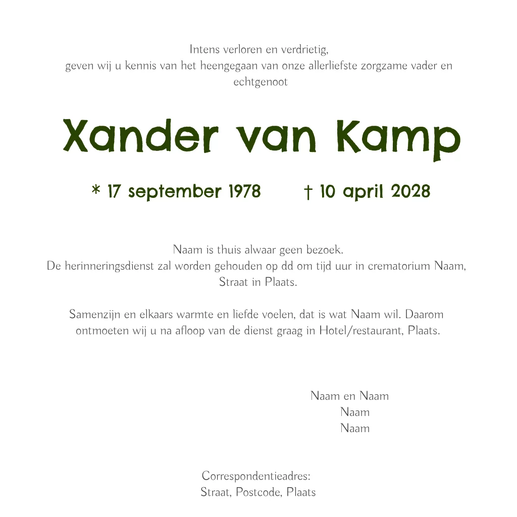 Rouwkaart met prachtige bomen laan met veel groen. De naam van de overledene op de voorzijde.