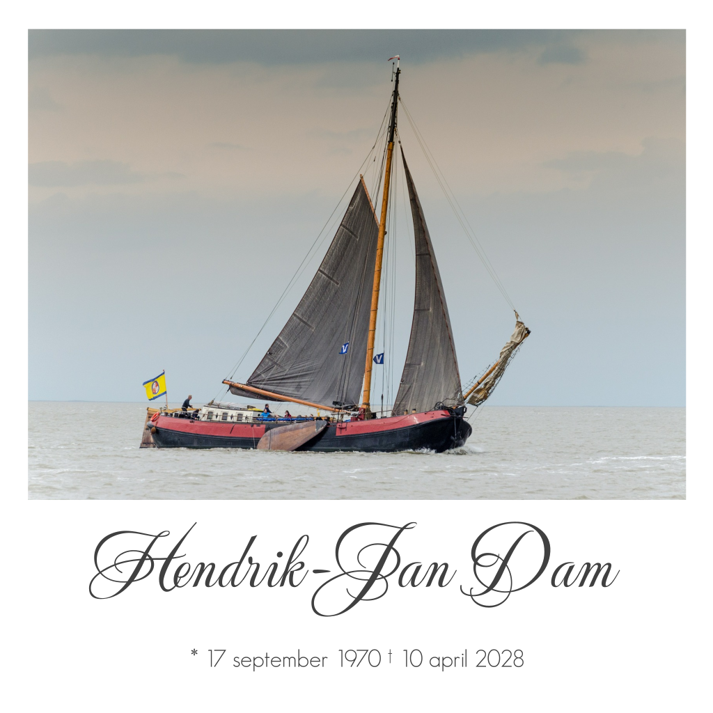 Rouwkaart met afbeelding van een Friese tjalk skutsje op zee