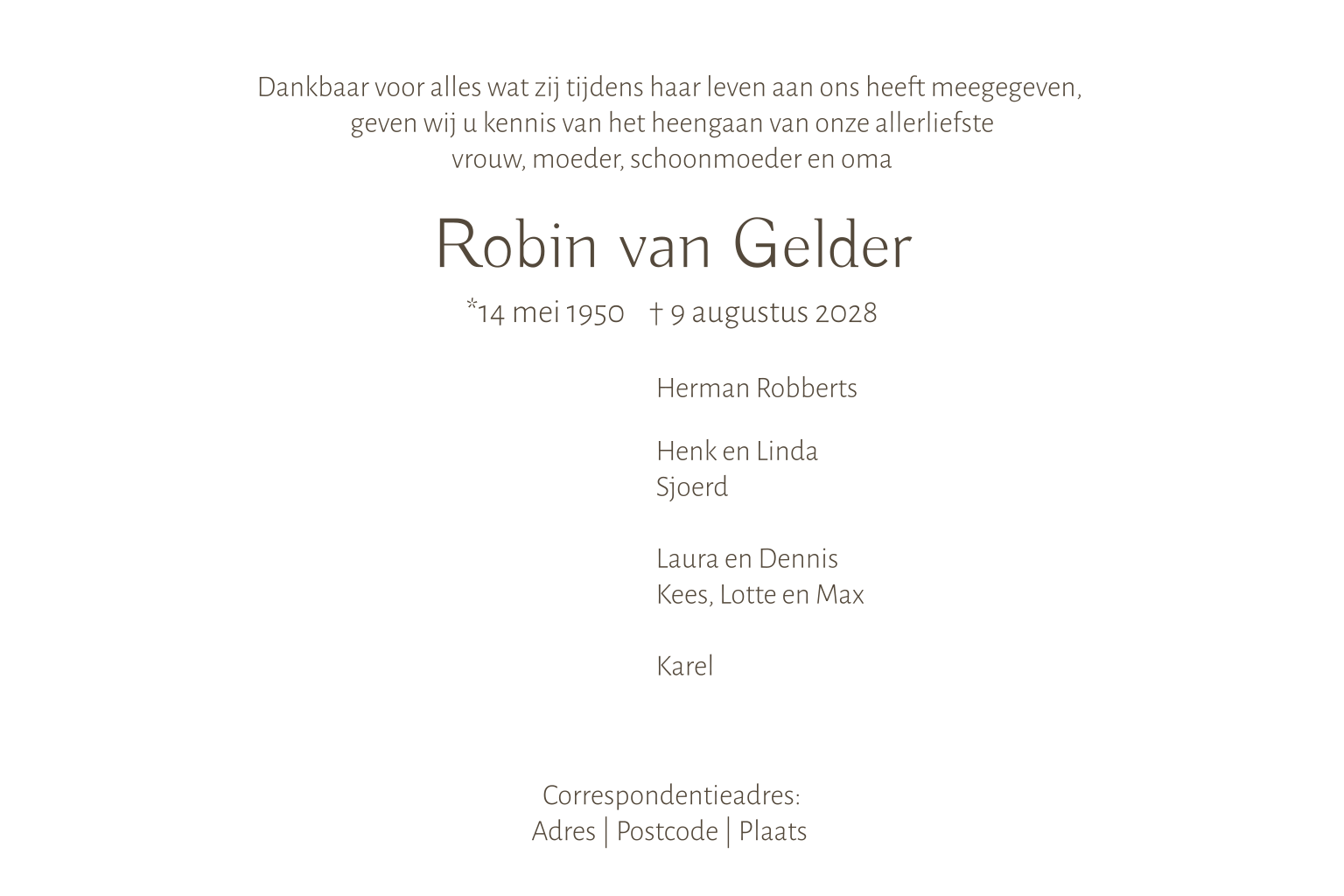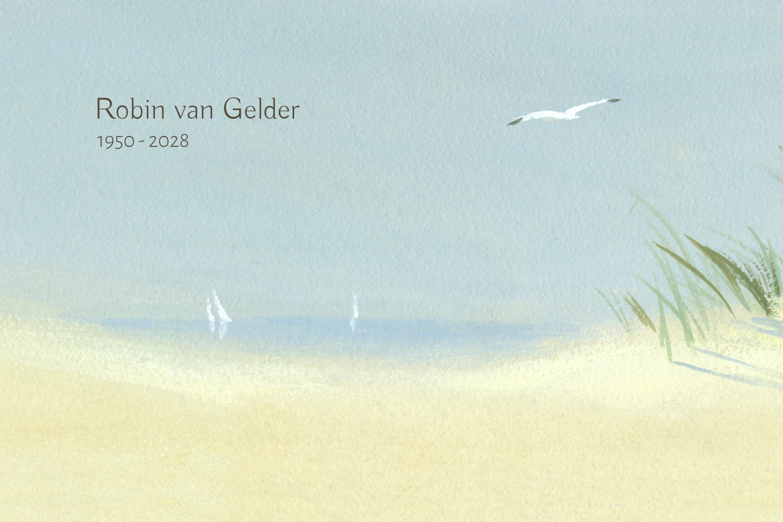Rouwkaart met een aquareltekening van het strand, duinen, de zee, zeilbootjes in de achtergrond en een wegvliegende vogel. (903)