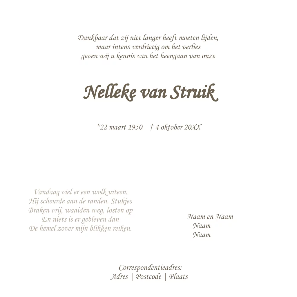 Rouwkaart strand en zee met wolken stralen jakobsladder. Wit vlak met naam en geboorte- en sterfdatum overledene. (86)