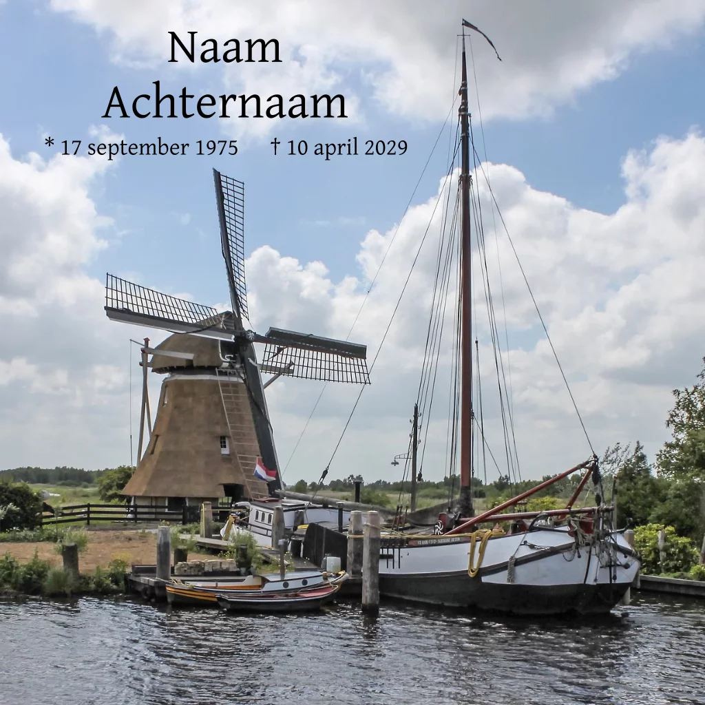 Rouwkaart met foto van een molen en een Friese Tjalk, Skutje. (516)