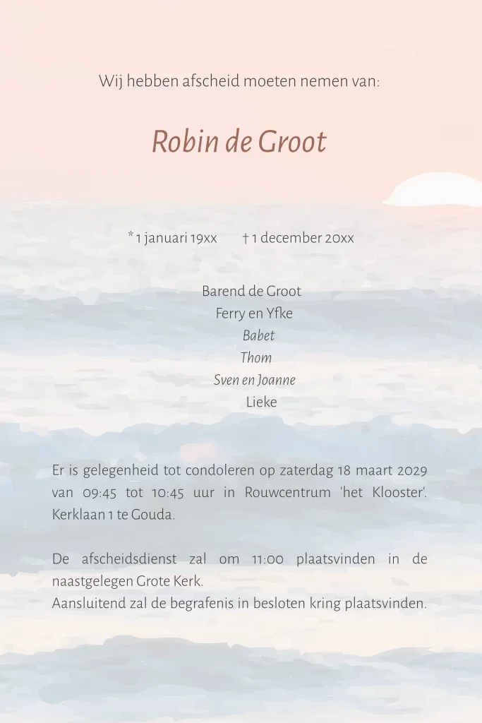 Rouwkaart man of vrouw met zee aquarel zonsondergang