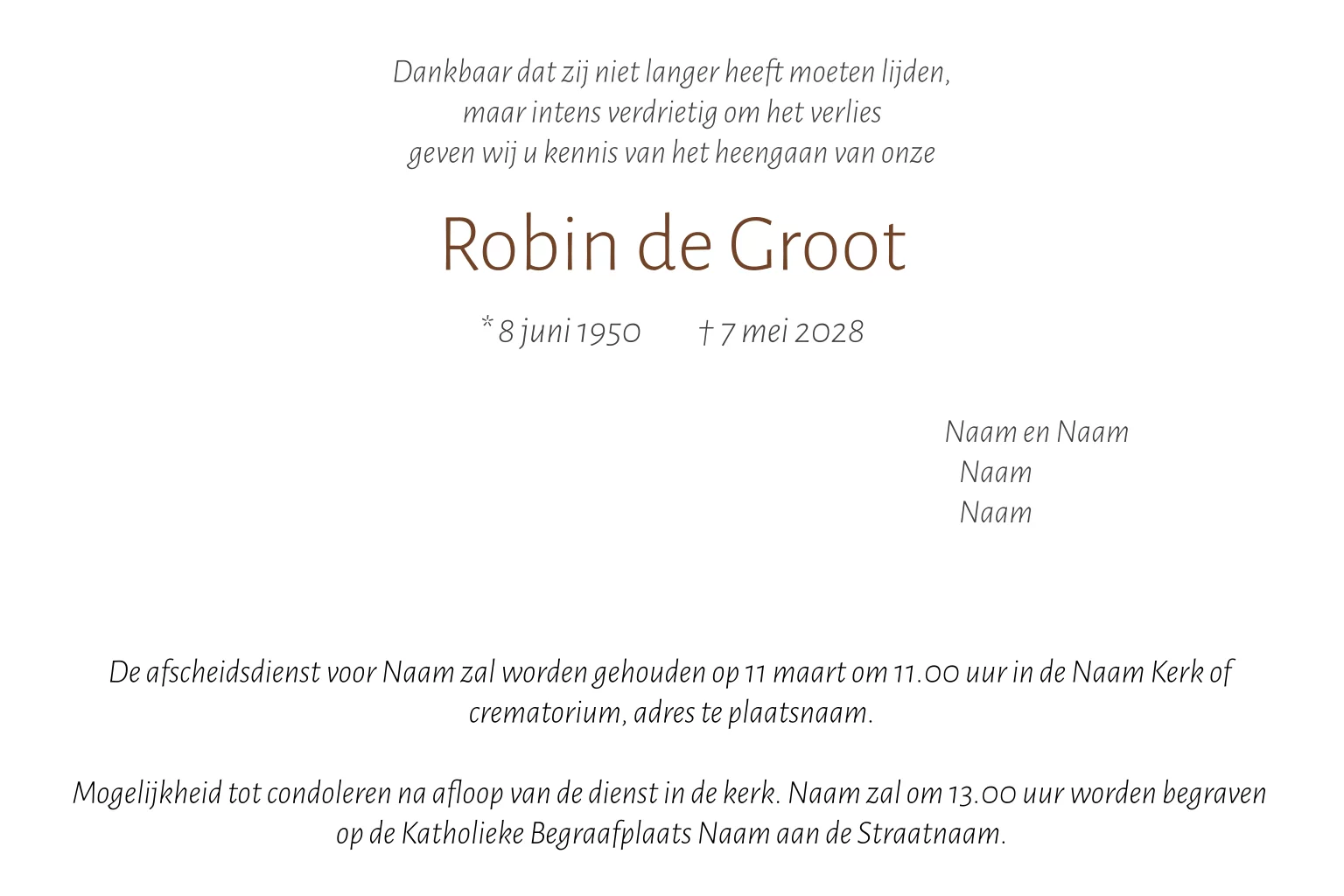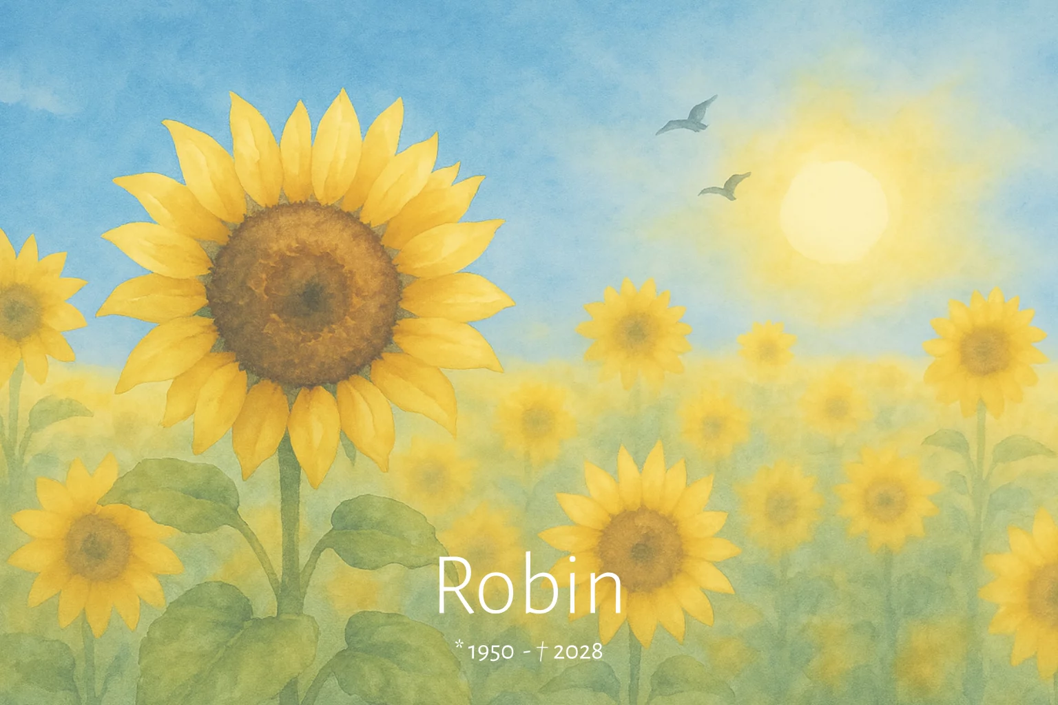 Rouwkaart met een aquarel van een veld met zonnebloemen, blauwe lucht en de zon. (555555)