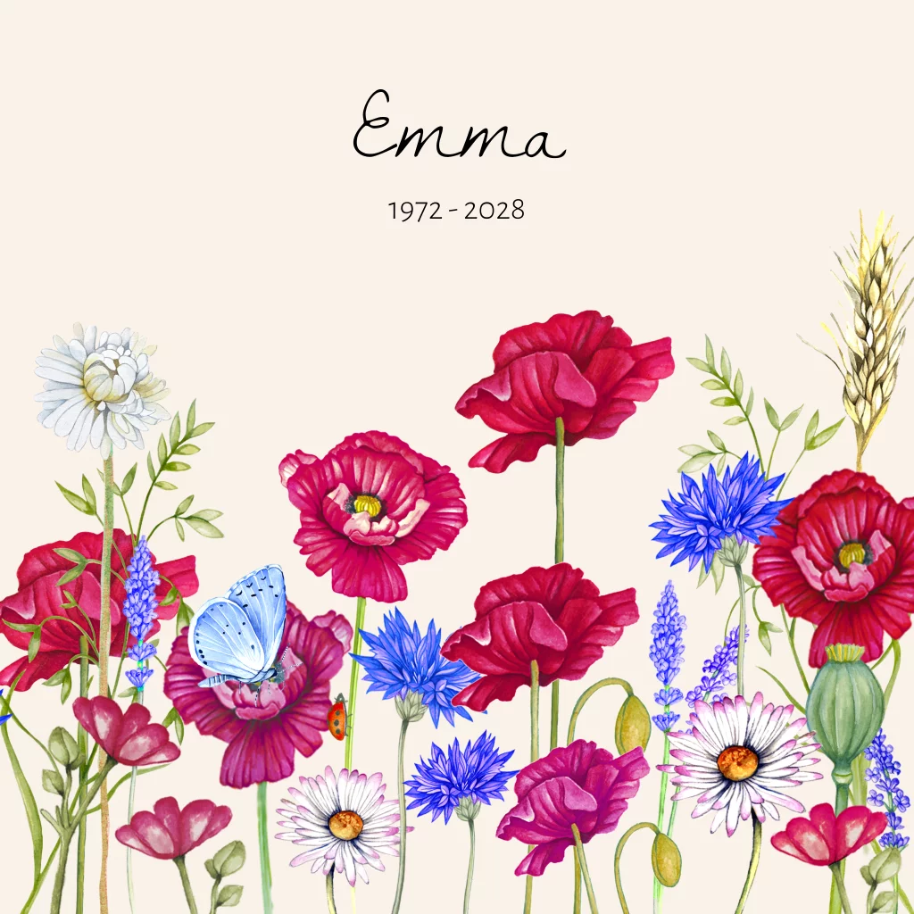 Rouwkaart met mooie veldbloemen klaprozen en korenbloemen in het veld. Verschillende vrolijke kleuren zorgen voor een fris geheel op deze kaart. De achtergrond is lichtroze maar kan naar wens aangepast worden .(912)
